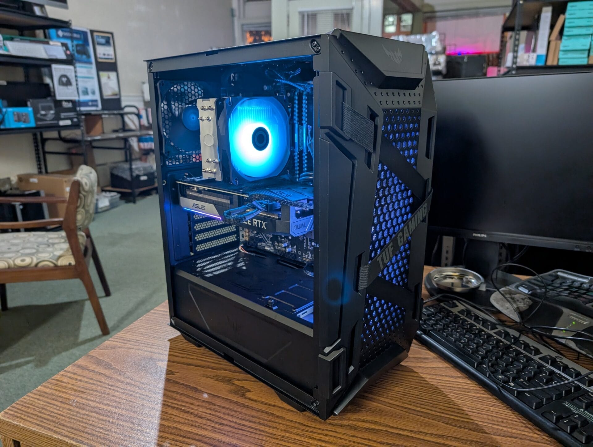 Housed in the sleek ASUS TUF Gaming GT301 Mid-Tower Compact Case, this system offers robust protection with eye-catching aesthetics. The honeycomb front panel allows for optimal airflow, ensuring your components stay cool even during the most intense gaming sessions. The case also features Aura Addressable RGB fans for customizable lighting, a convenient headphone hanger, and supports a 360mm radiator for future cooling expansion. With two USB 3.2 ports, you have fast connectivity at your fingertips.