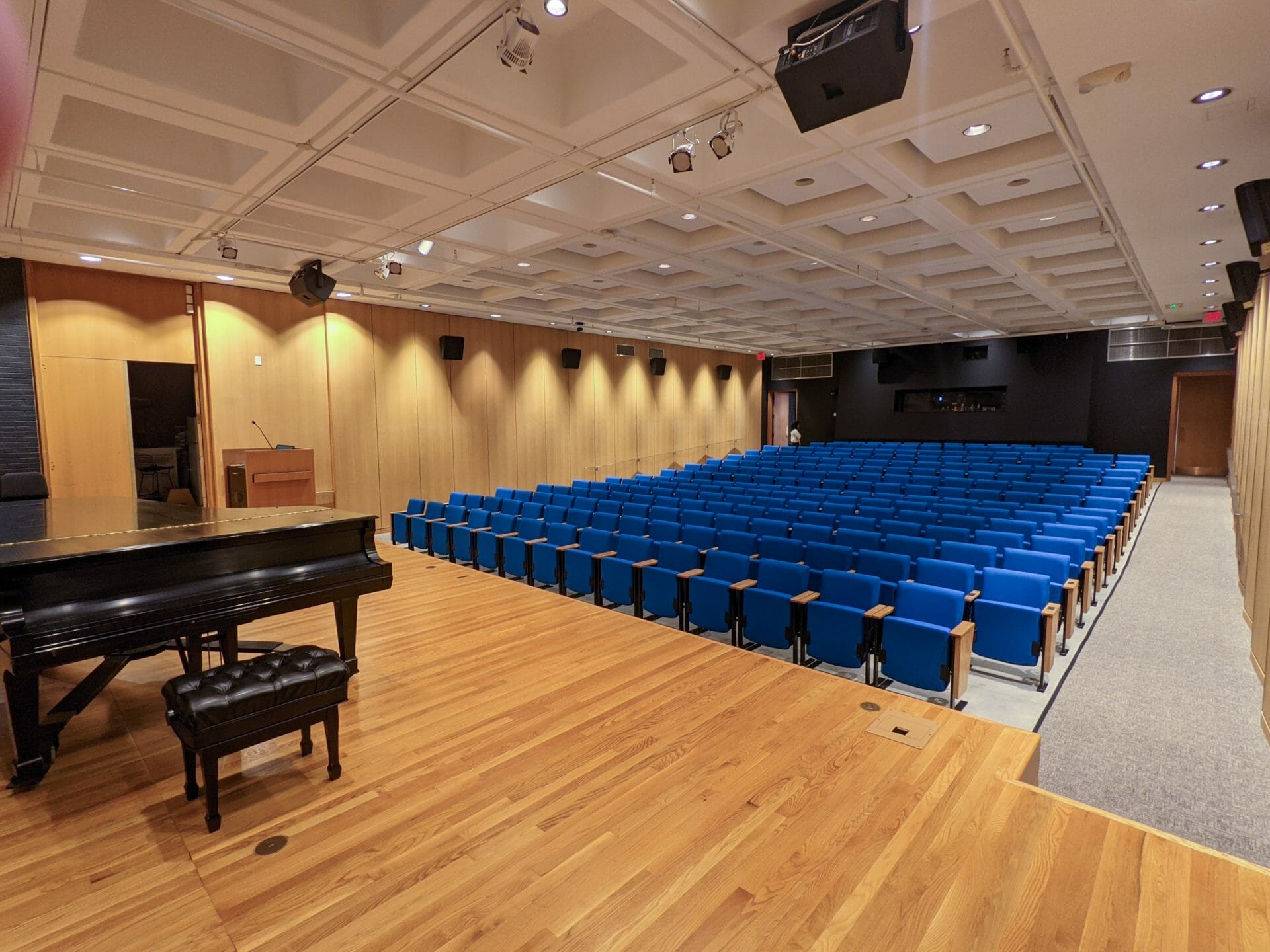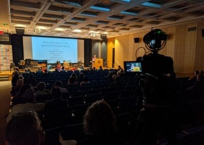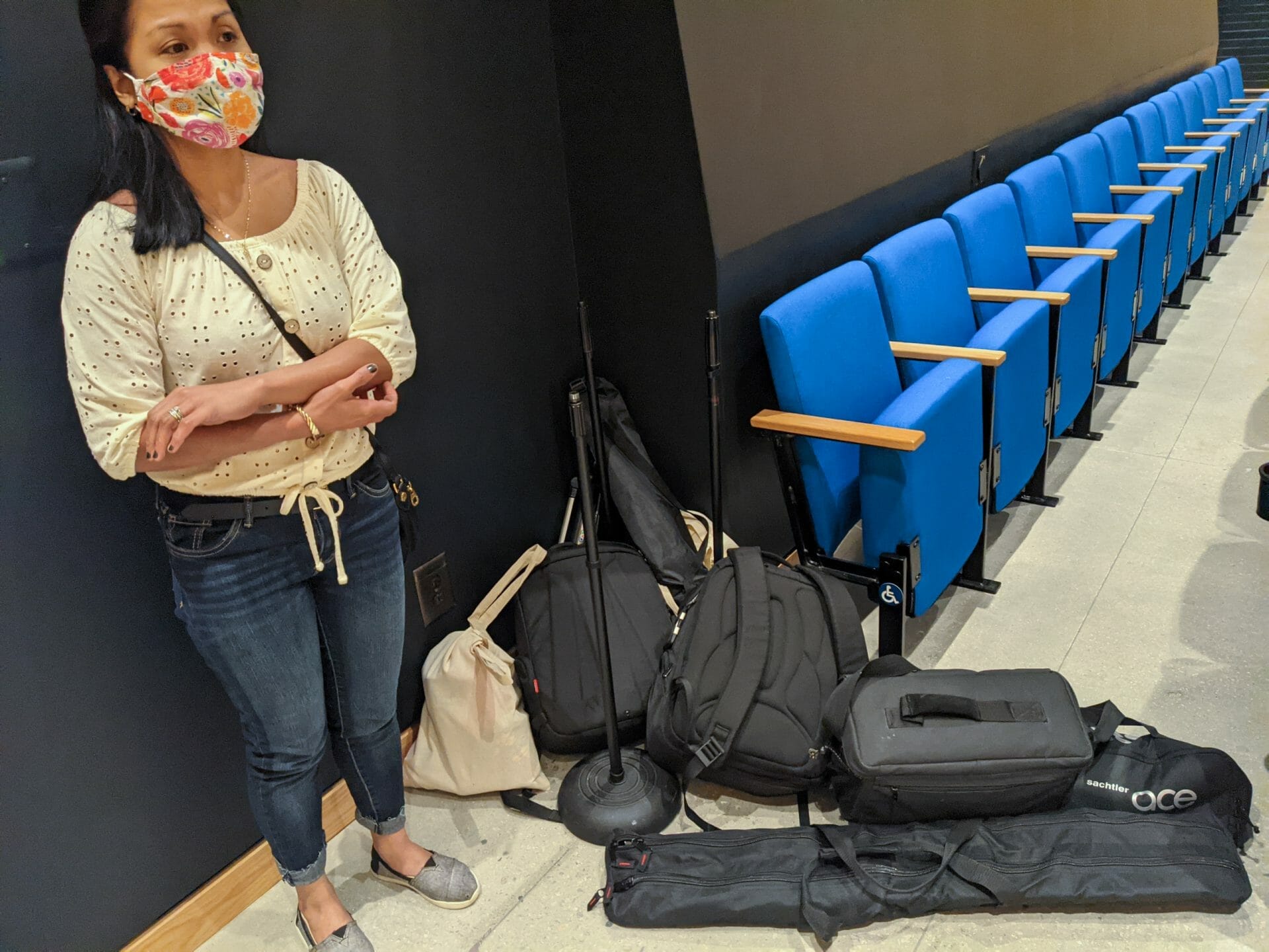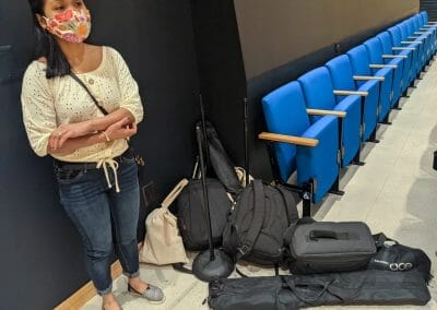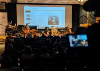 This particular video was challenging for us as we usually do not provide the microphones for the main content. We have some mics we use for audience, and backup, but we typically receive audio from the venue’s audio feed, although we do provide the recorders. However, in the case of “Chamber Music” the performers are typically not miced and not run though the venue PA. We purchased some extra microphones for this purpose and tried to strategically place all our mics around the room to pick up the bands that would set up in 3 different areas on the stage. Some of the bands instruments had their own mic and amplifier for the quieter instruments, but we still did not have access to that audio. Combining our various mics and audio editing in post production including some hefty eq and noise reduction I think we were able to do a decent job of capturing this on our amateur budget. Some behind the scene photos: